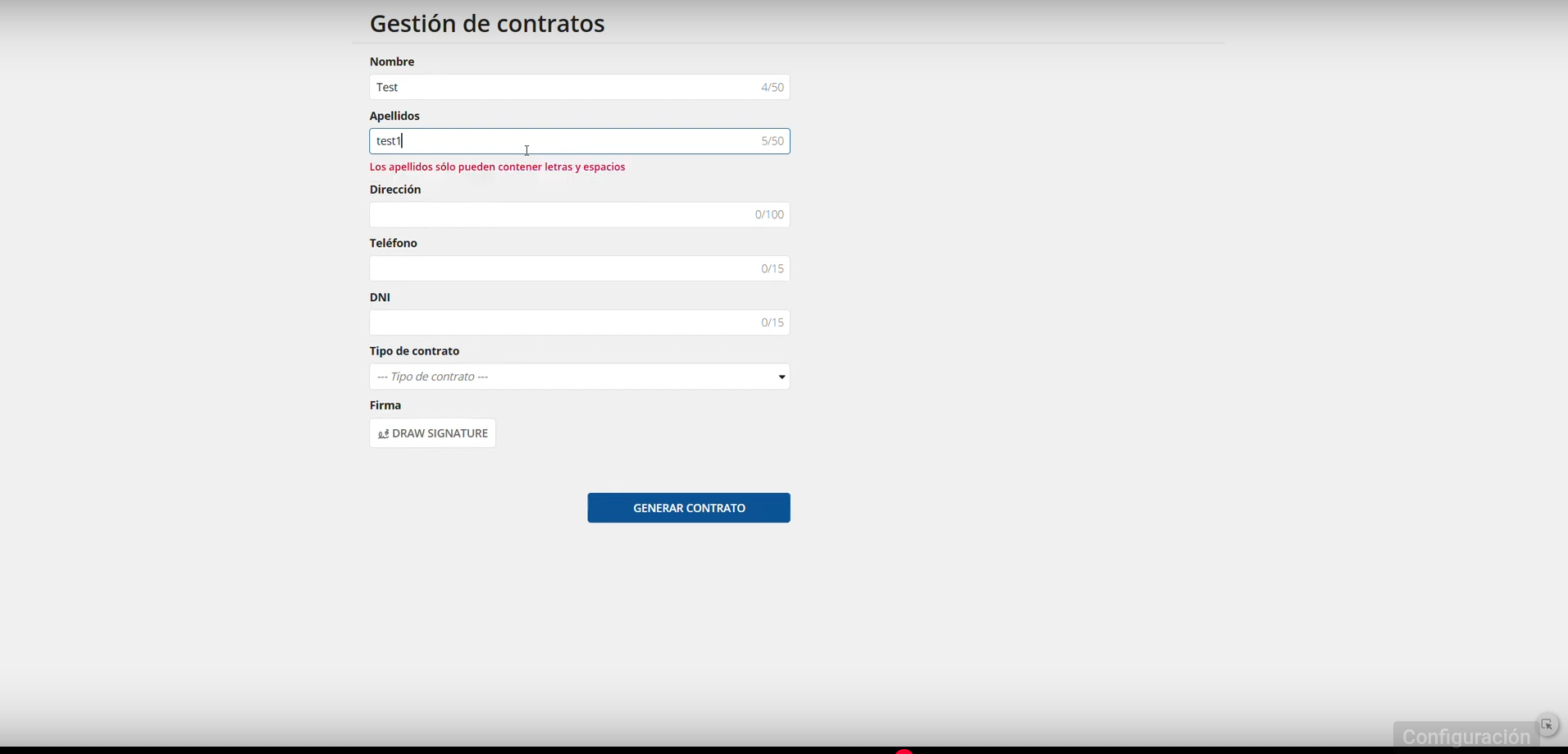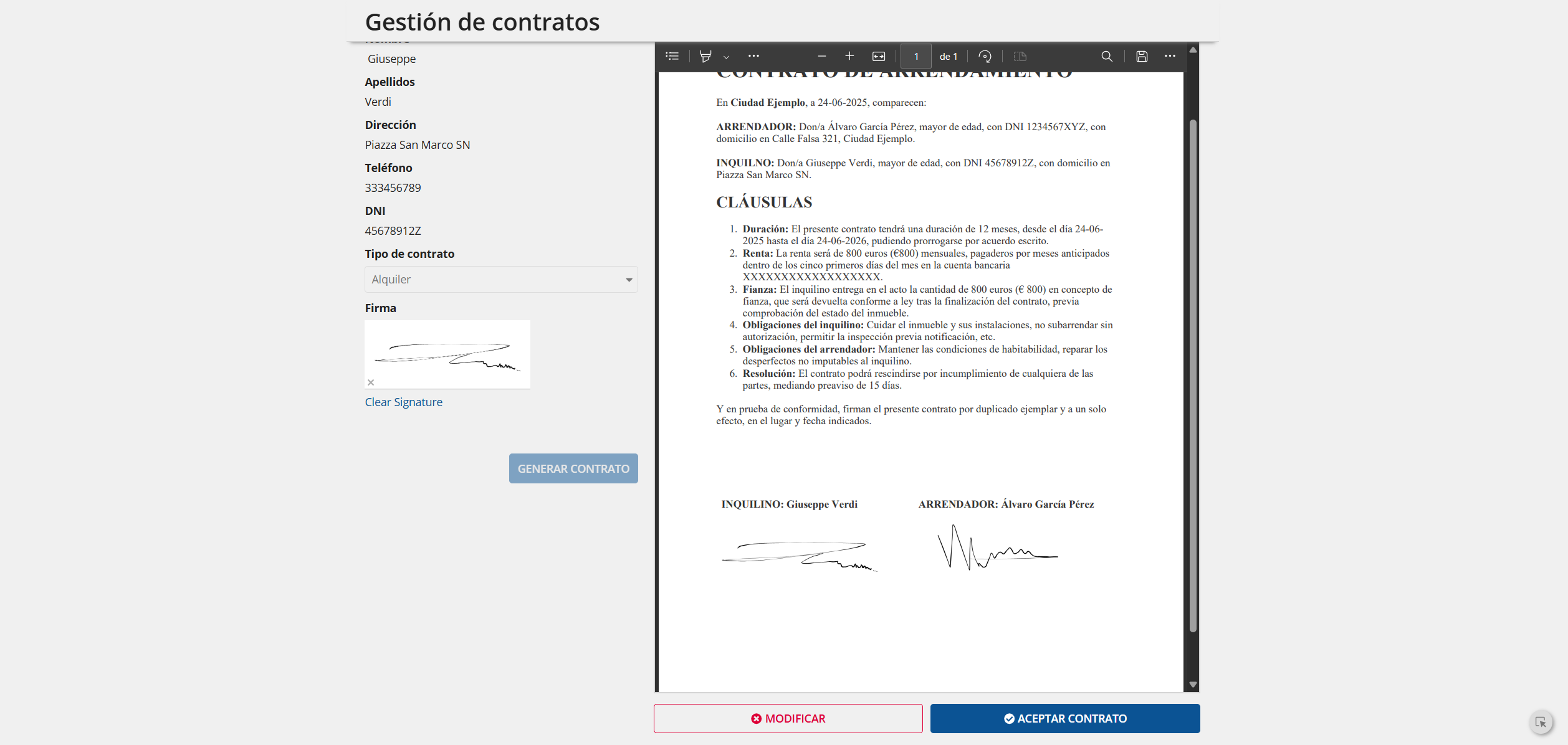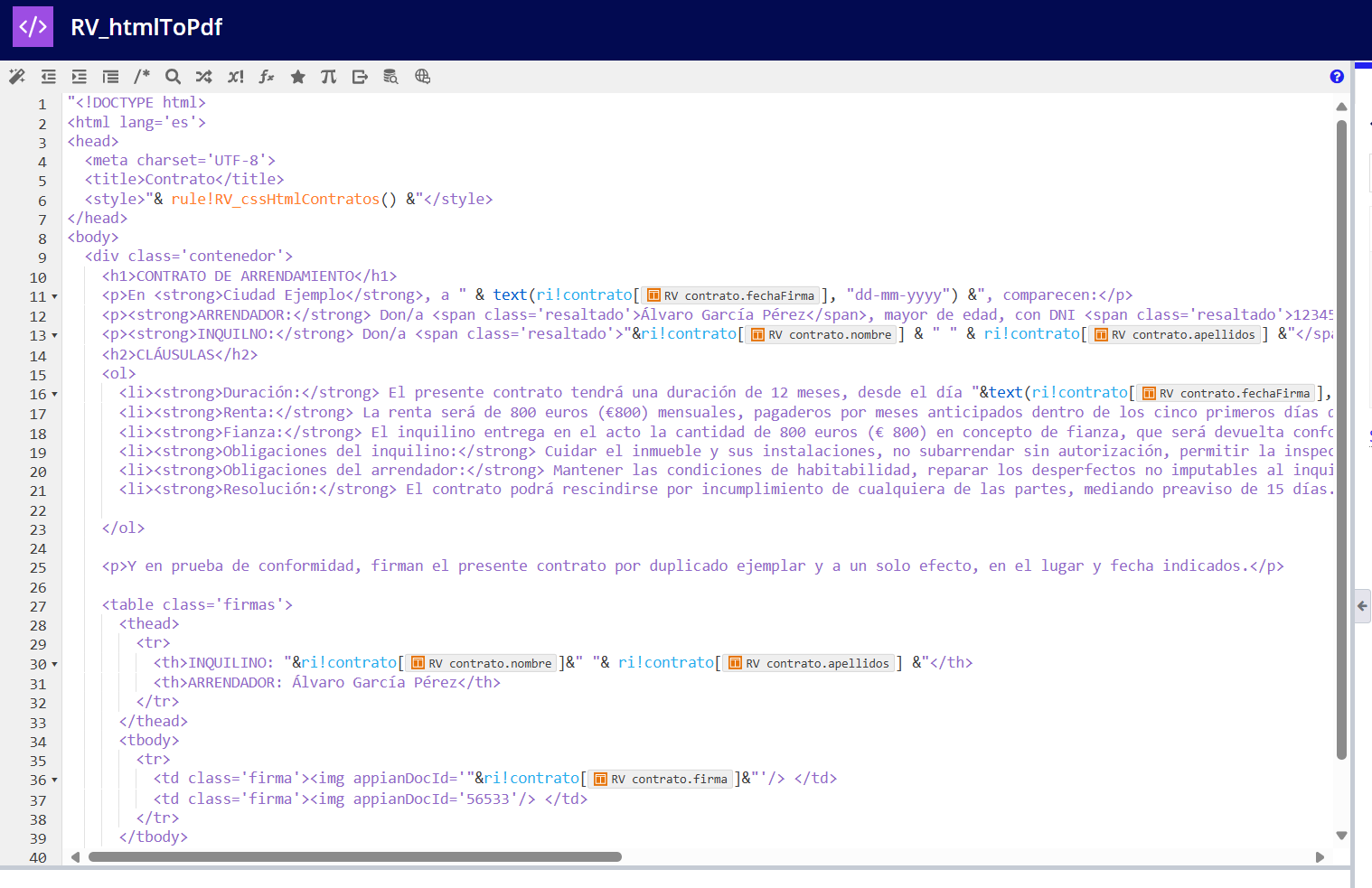 • Recogida de datos para la elaboración del contrato: Los datos proporcionados por el usuario se utilizan en una plantilla HTML para generar el código final del pdf